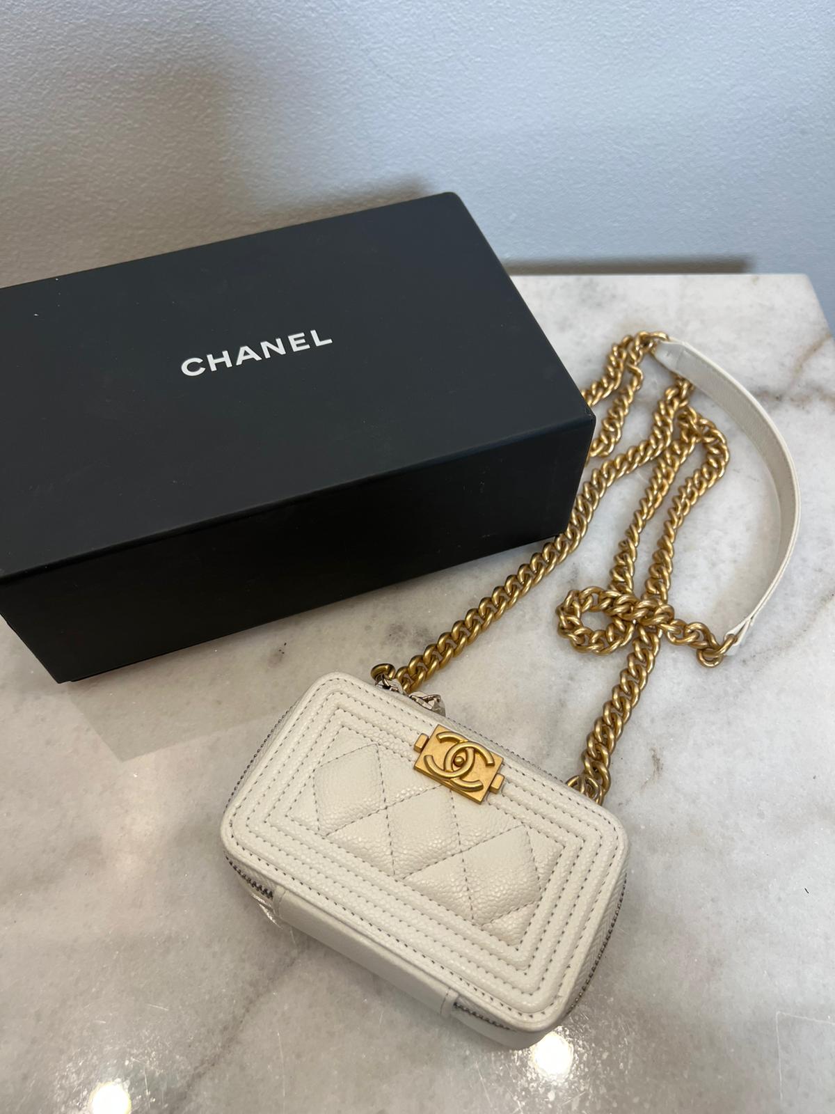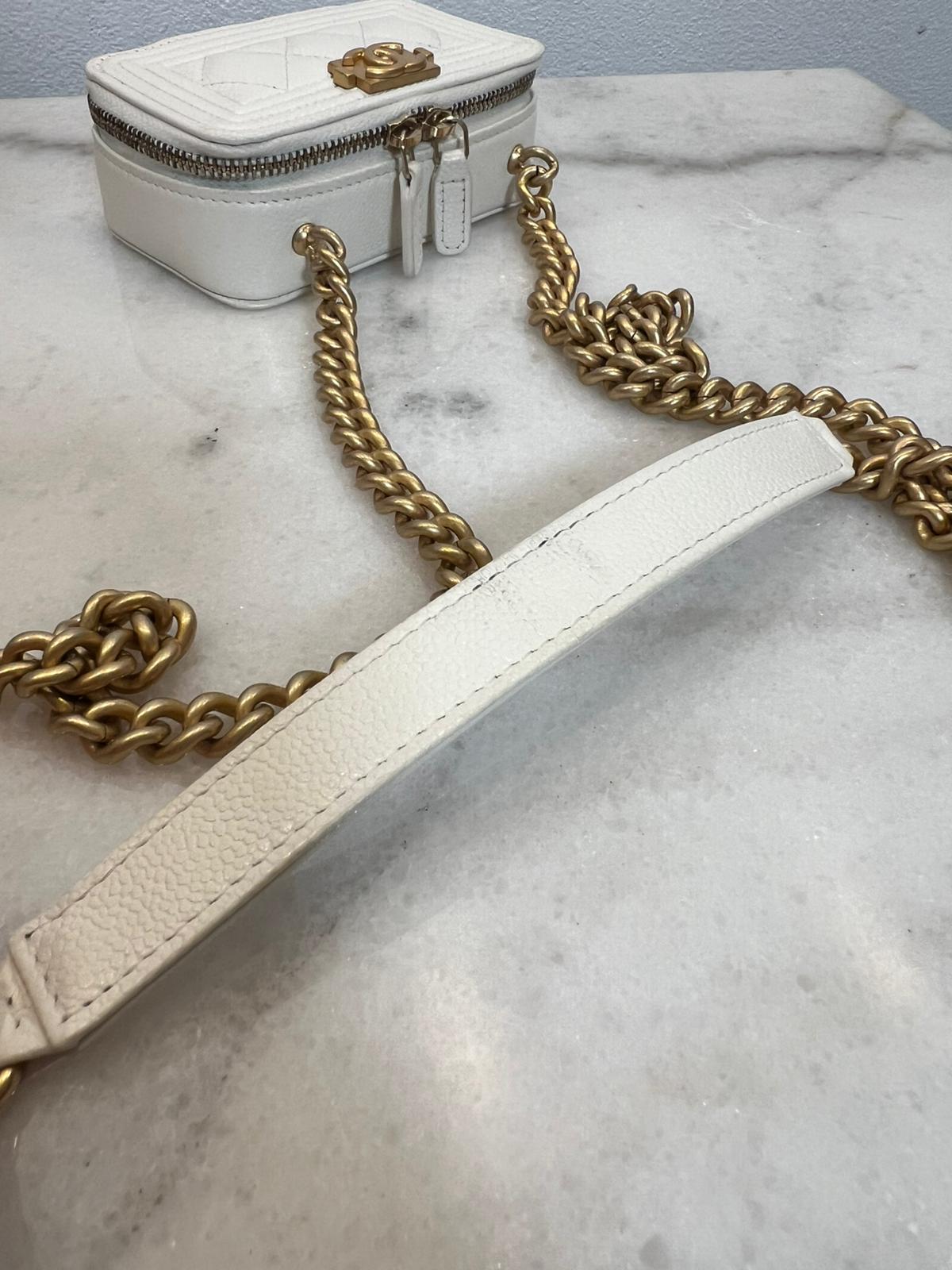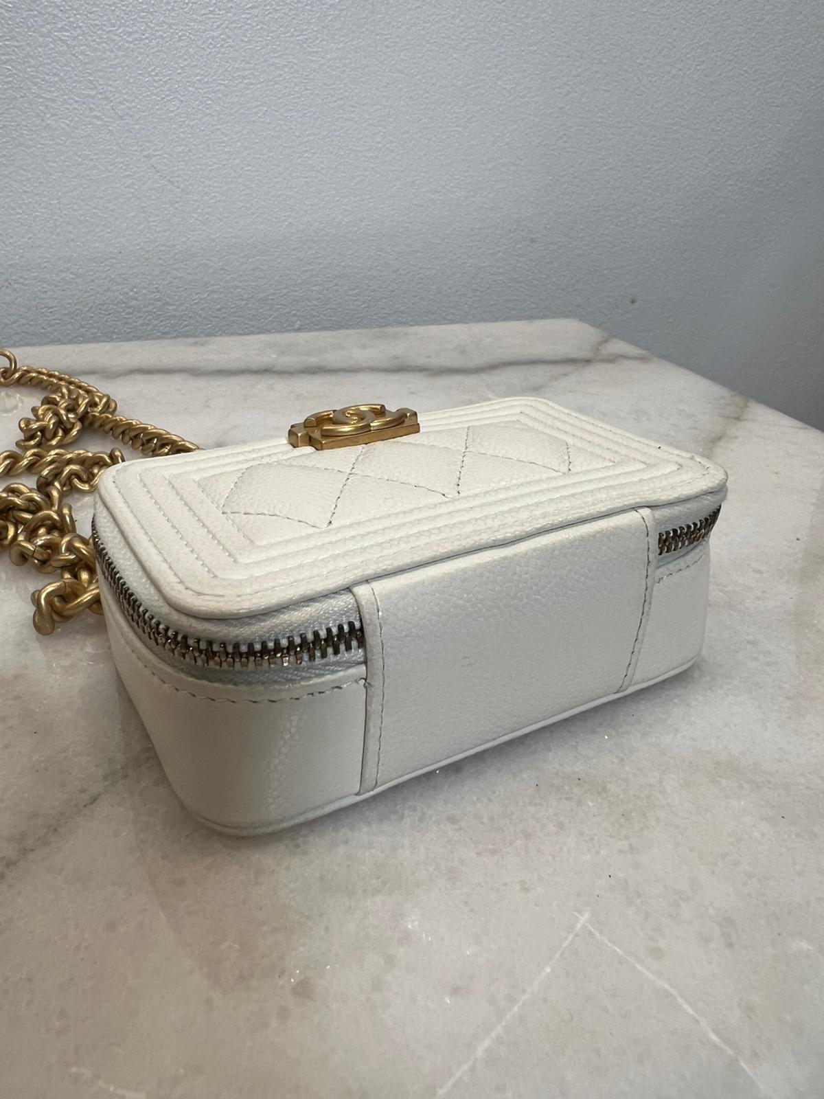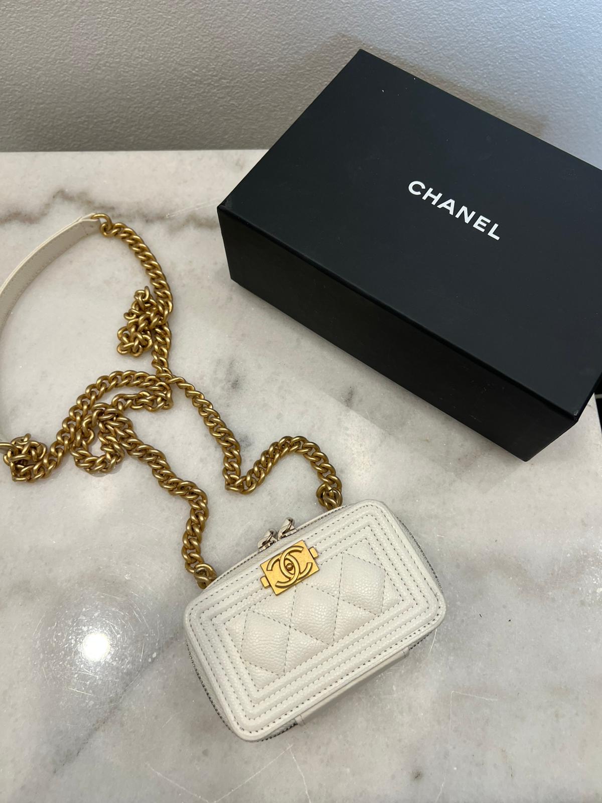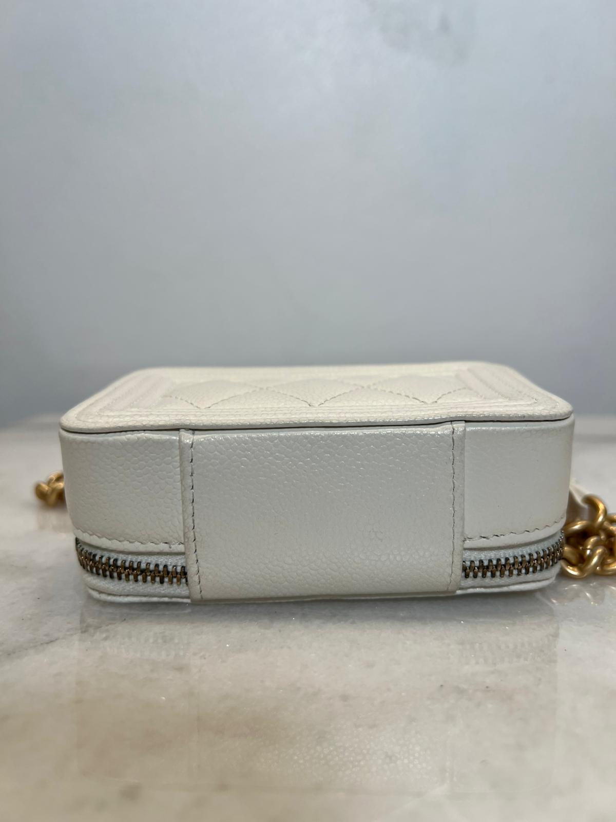 Description : White/ gold caviar leather, comes with dust bag and box, with receipt, RRP $3370, condition 9.5/10, slight creasing on leather strap, 12x7x4cm, no Chanel authenticity card included
