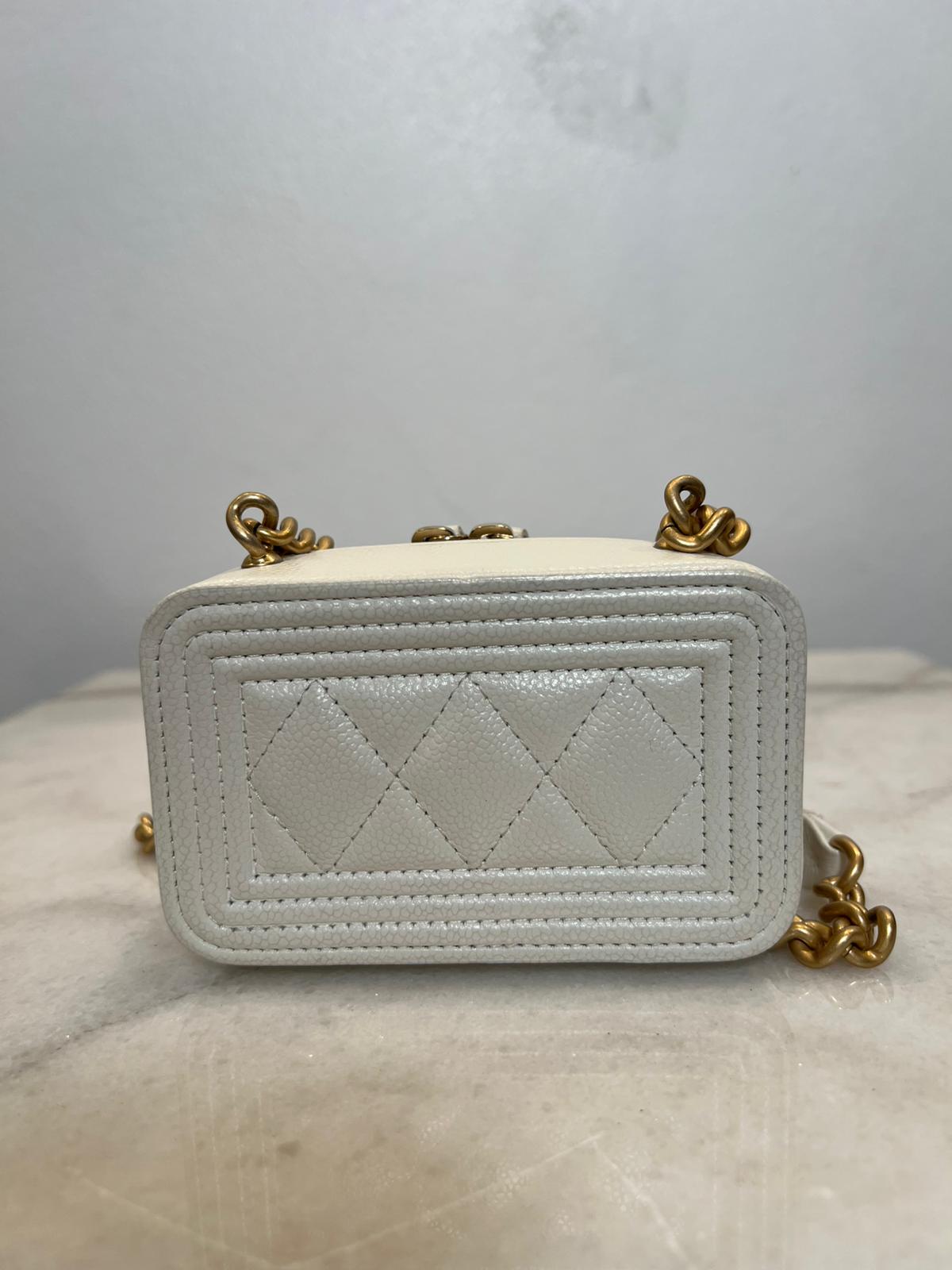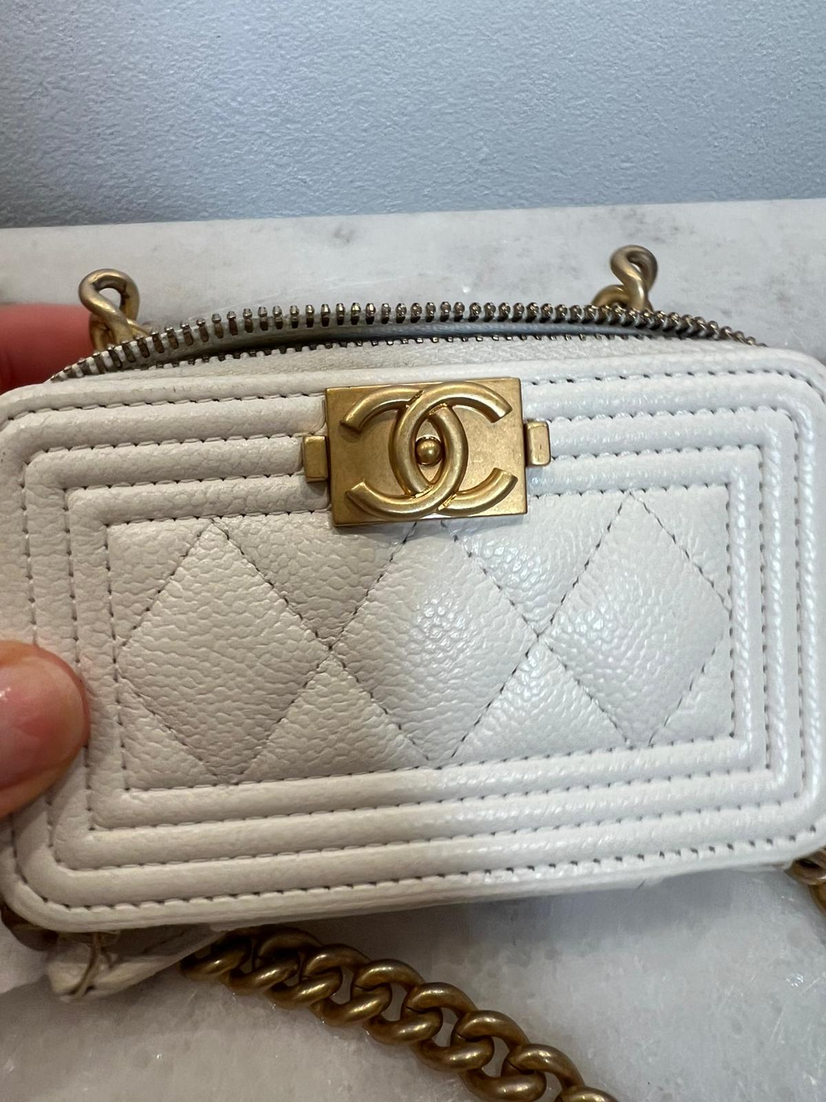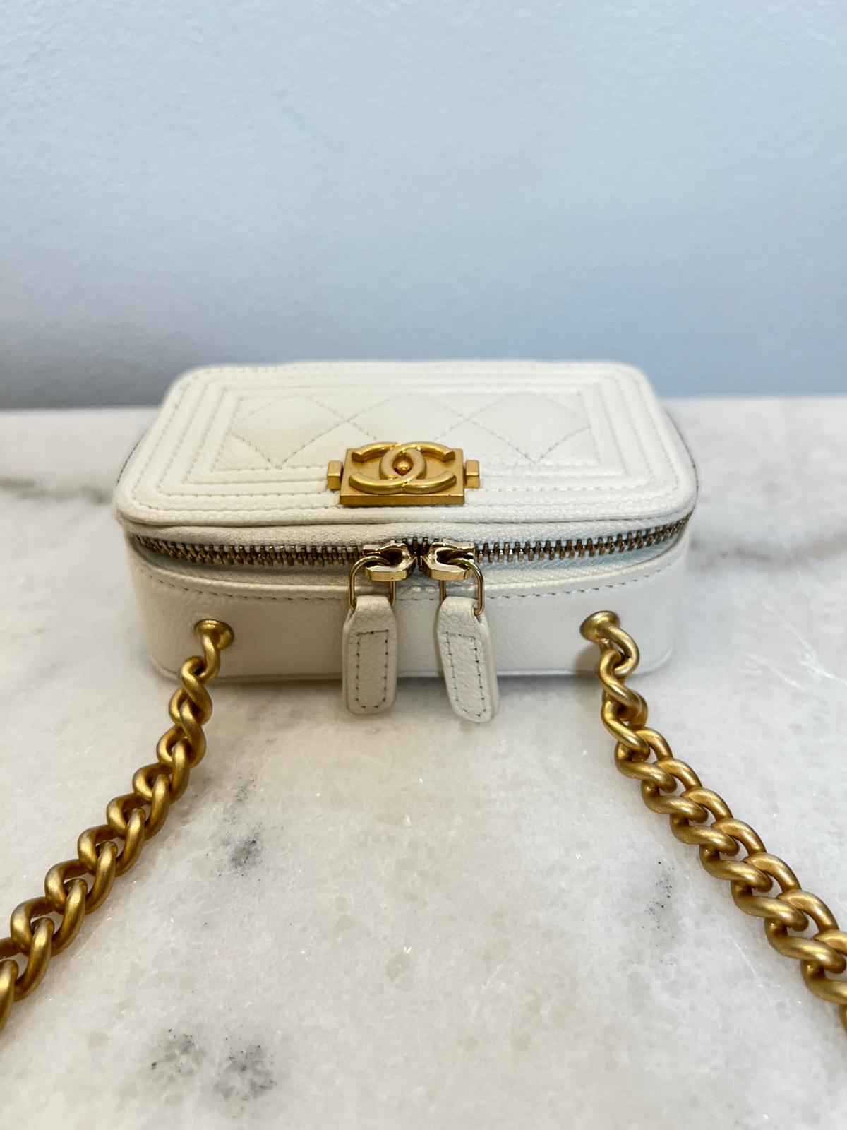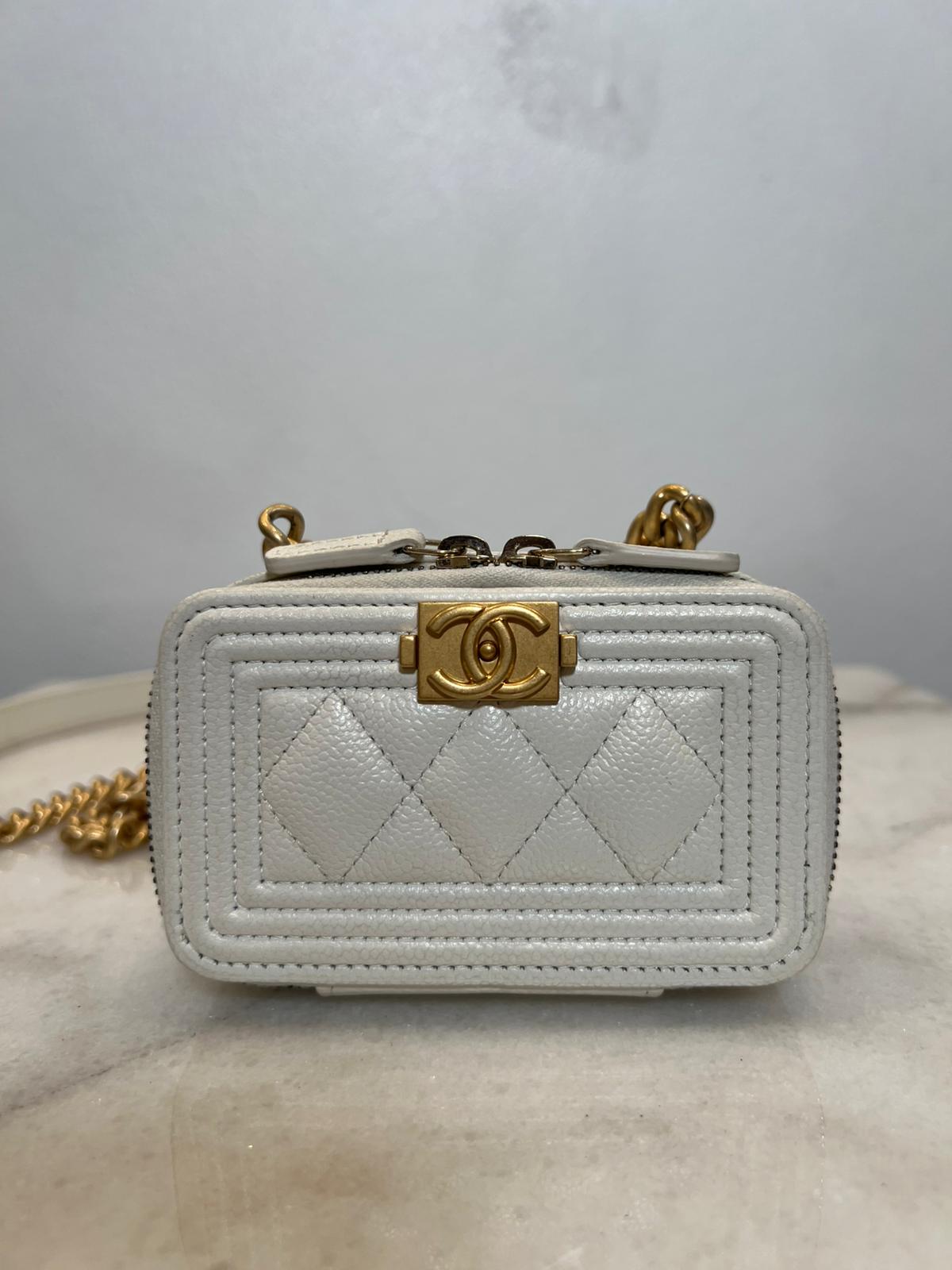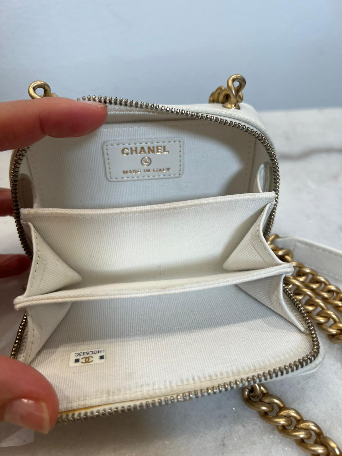 Description : White/ gold caviar leather, comes with dust bag and box, with receipt, RRP $3370, condition 9.5/10, slight creasing on leather strap, 12x7x4cm, no Chanel authenticity card included