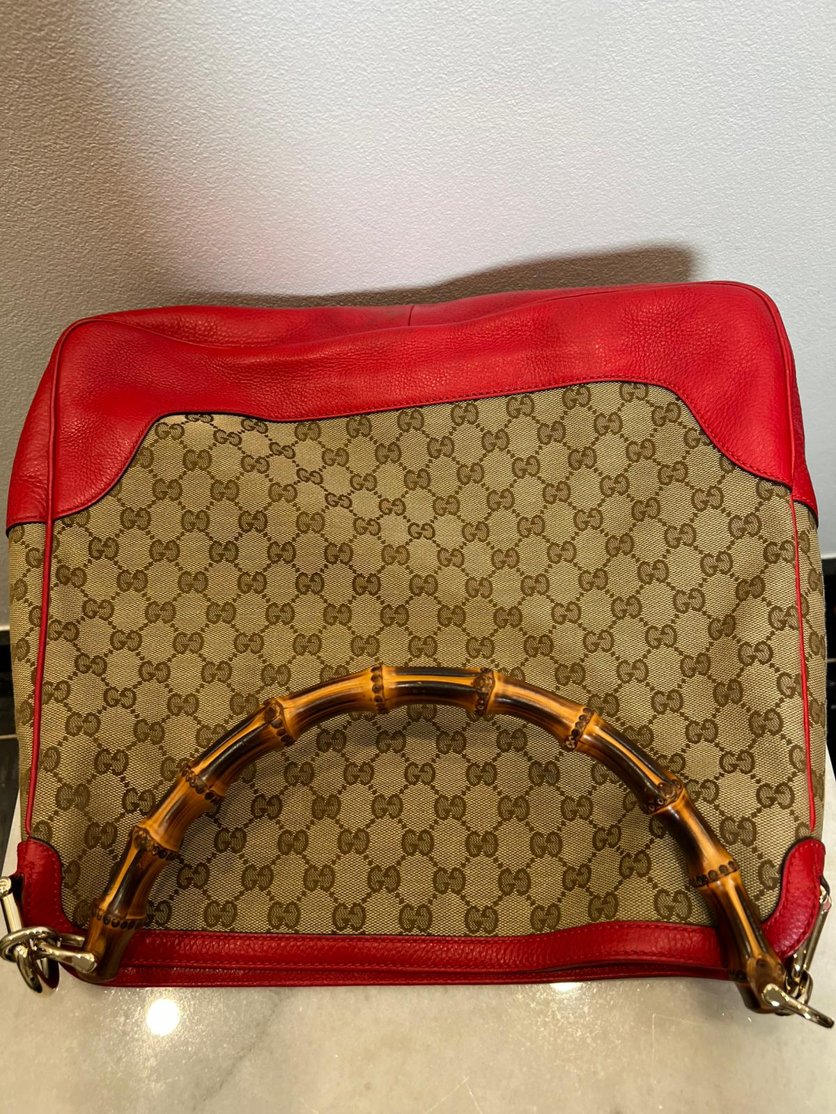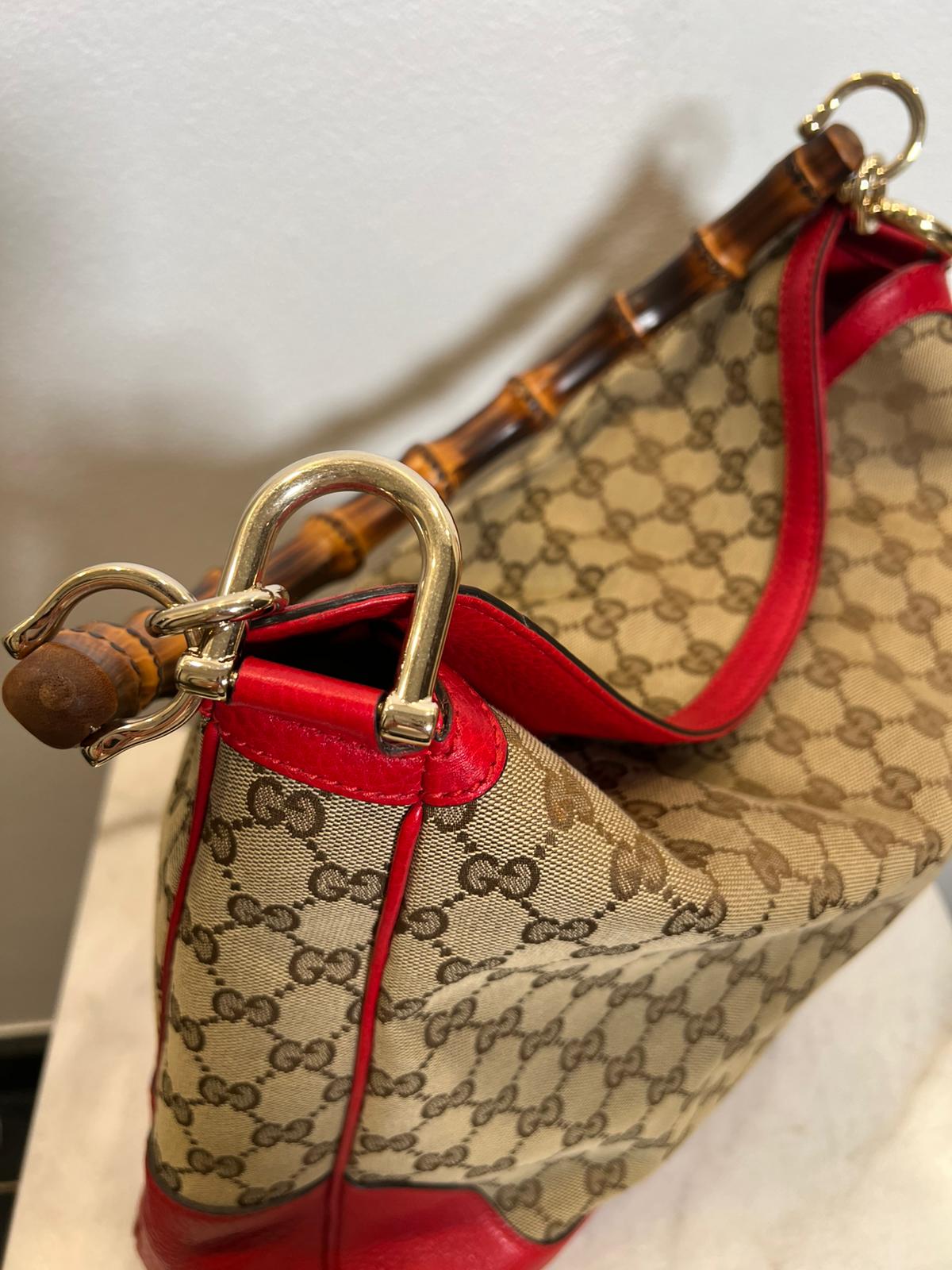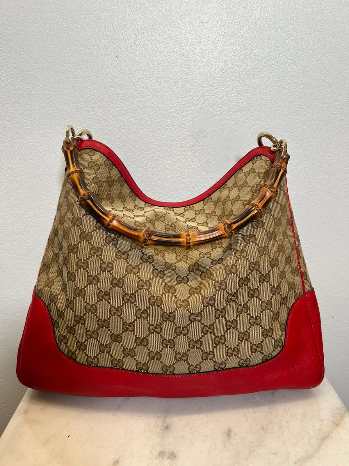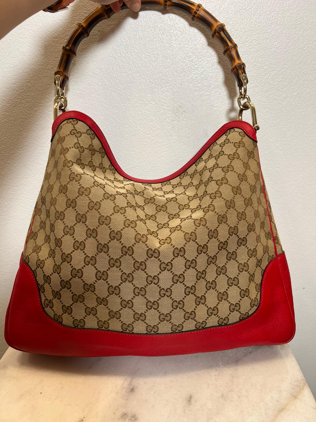 Gucci Logo GG Brown with Red Leather Trim and Bamboo Handle Large Diana Shoulder Bag