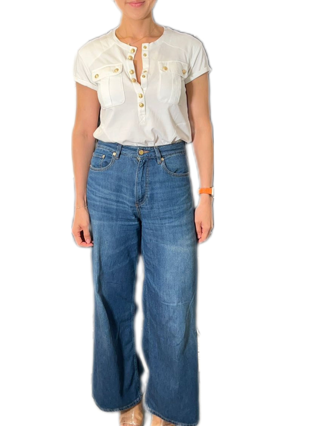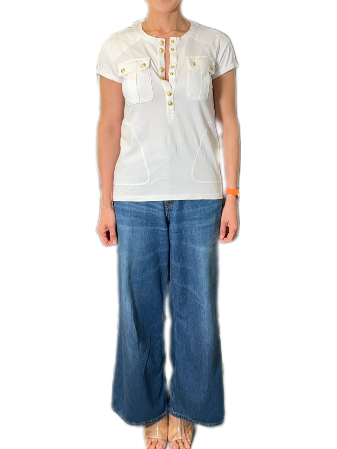 Balmain White Tee with Mini Gold Buttons and Front Pockets - size 36