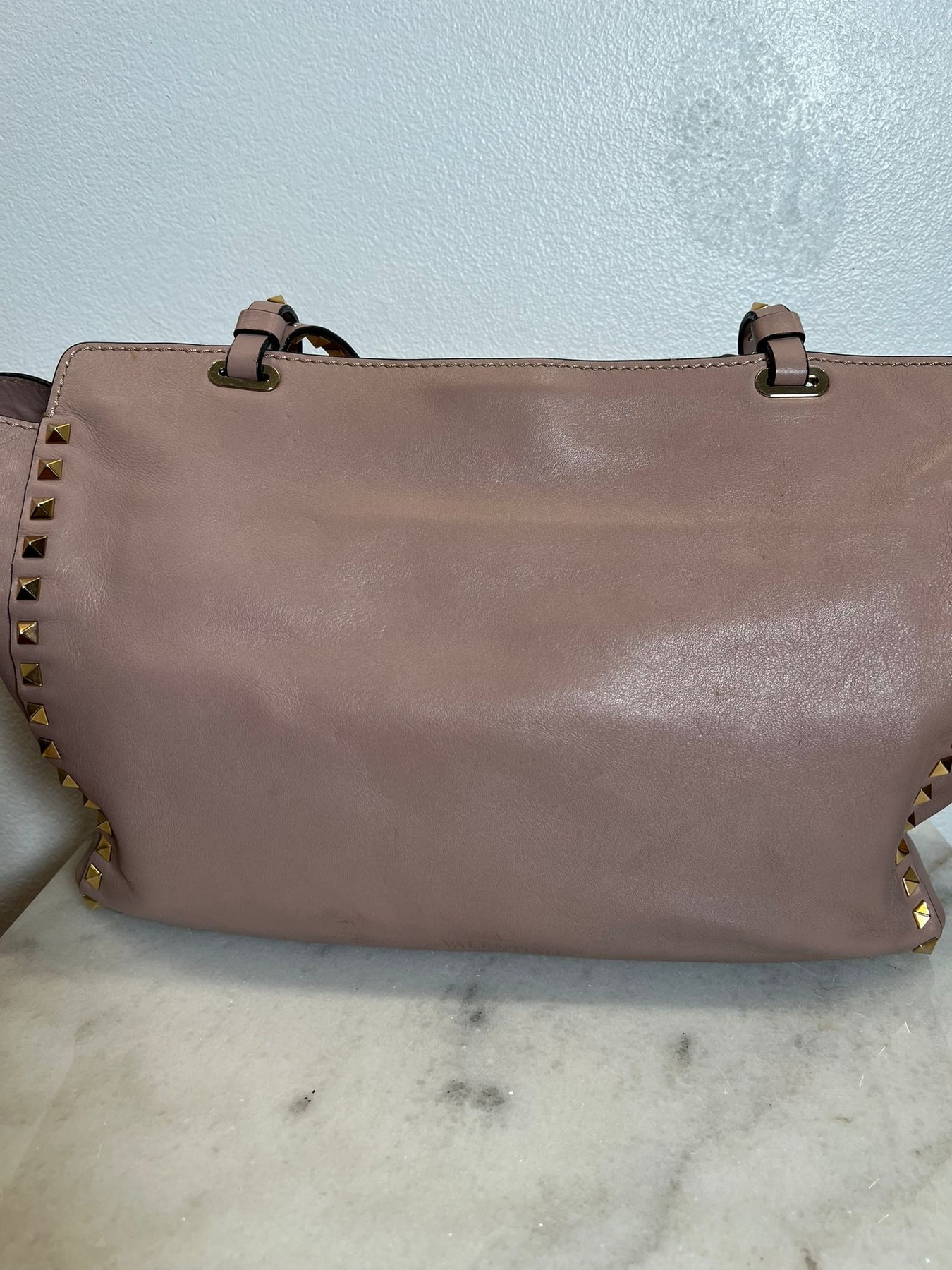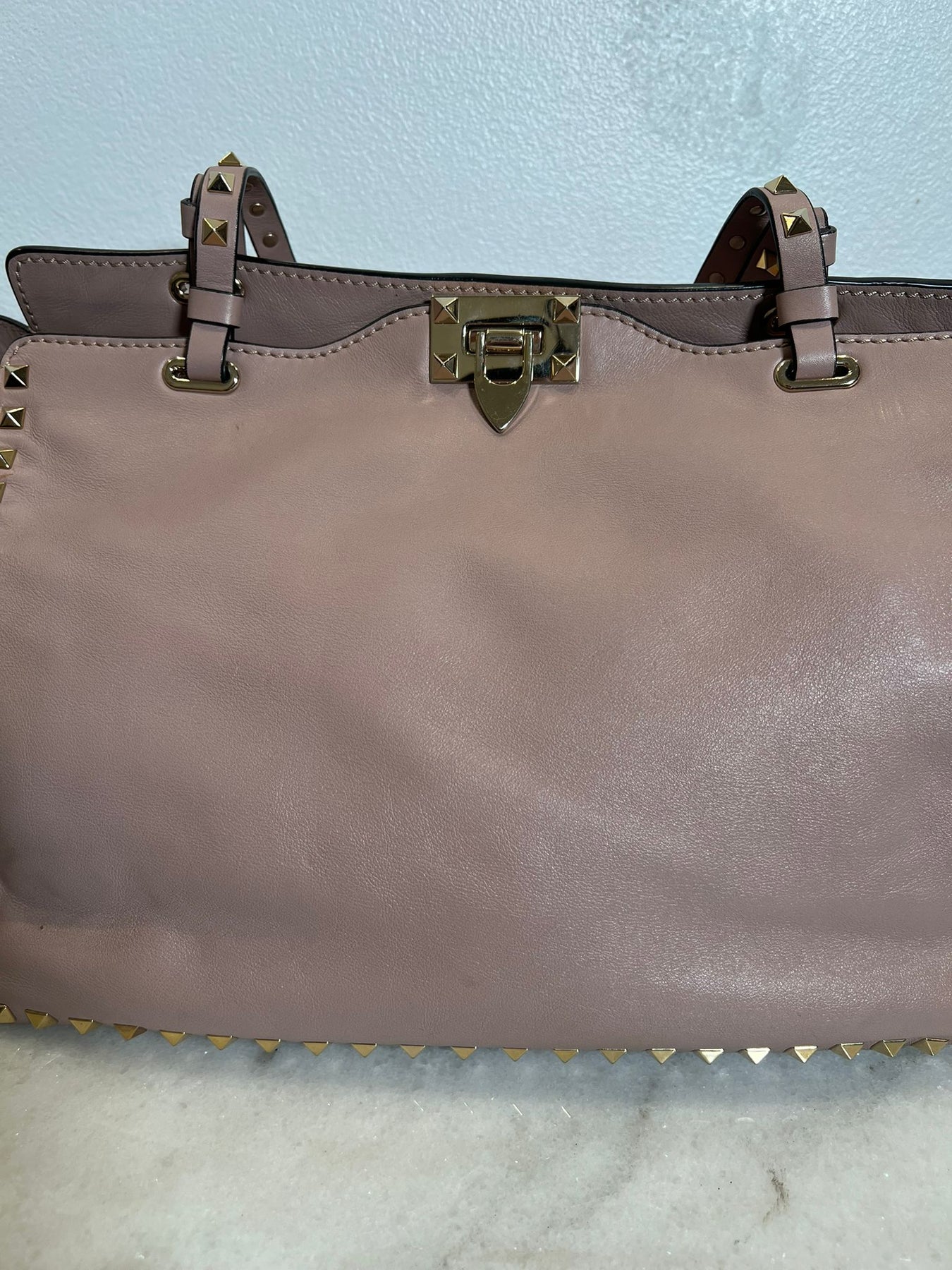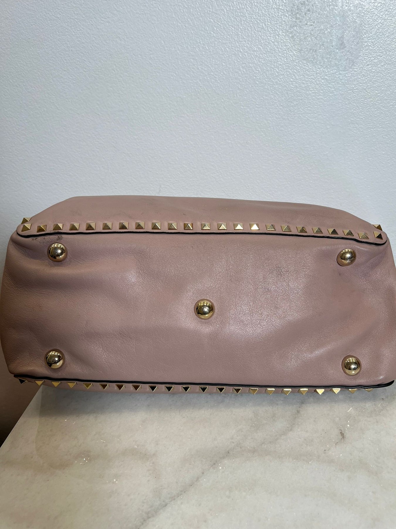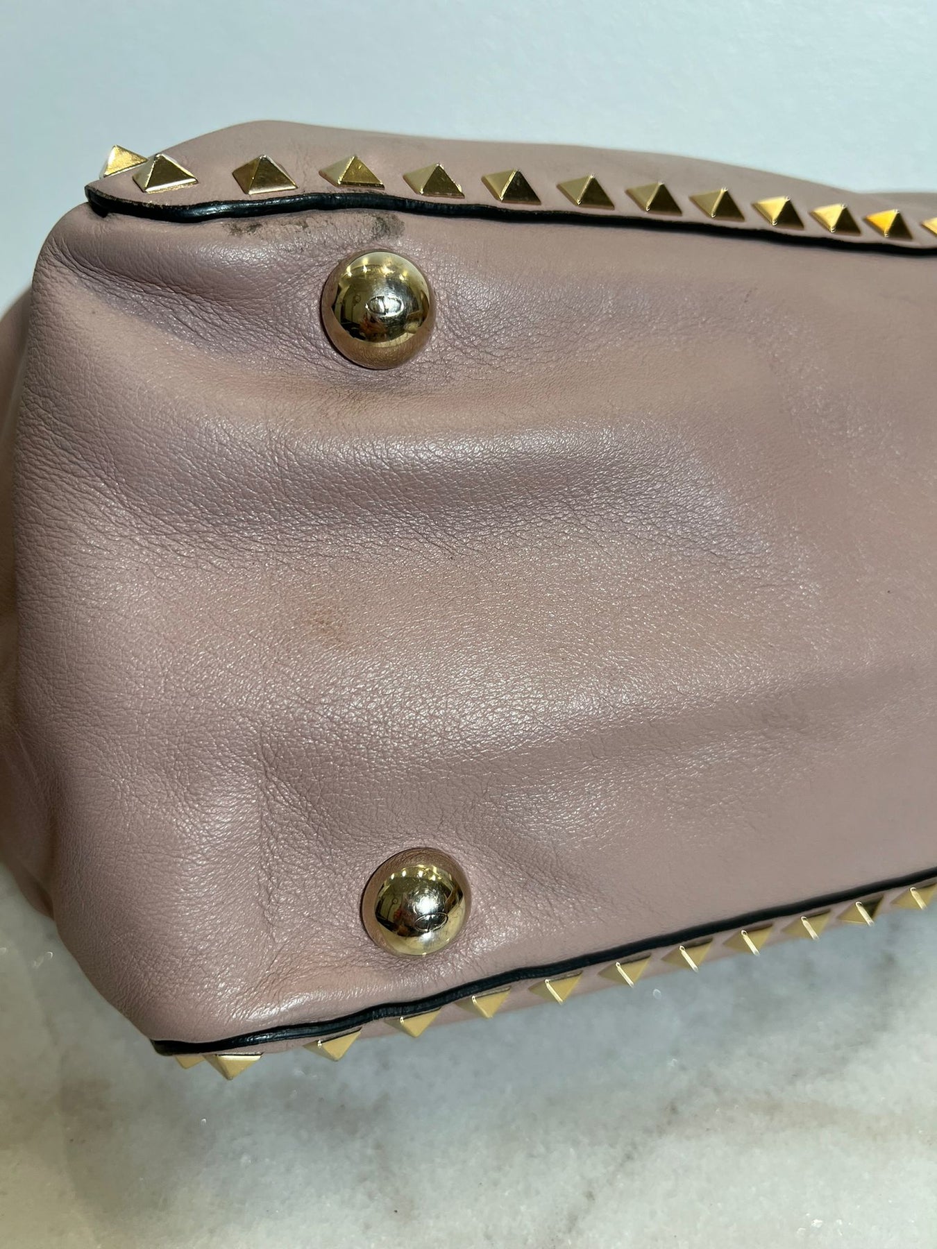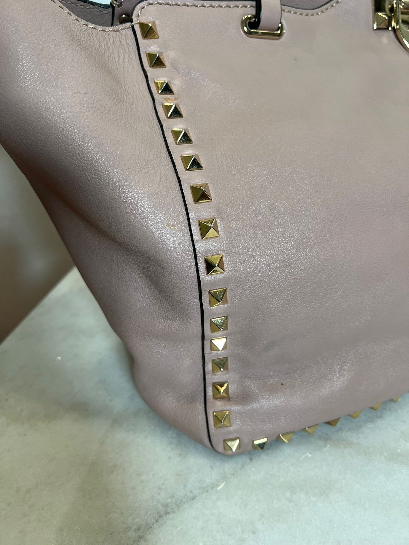 Description : Blush pink, condition 7/10, few marks on front and back and base, moderate wear, gold rockstud, 32x26x13cm, handle drop 20cm, no dust bag or box, comes with Entrupy certificate