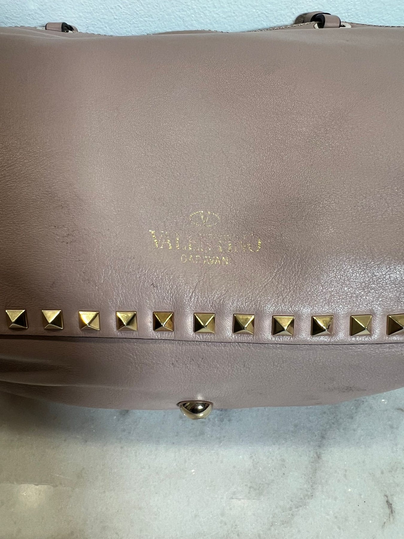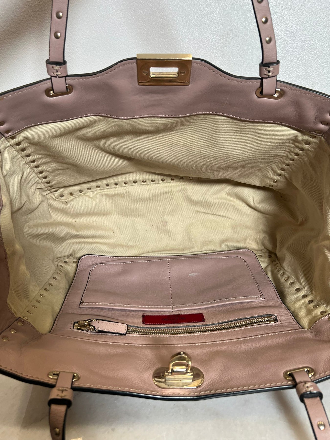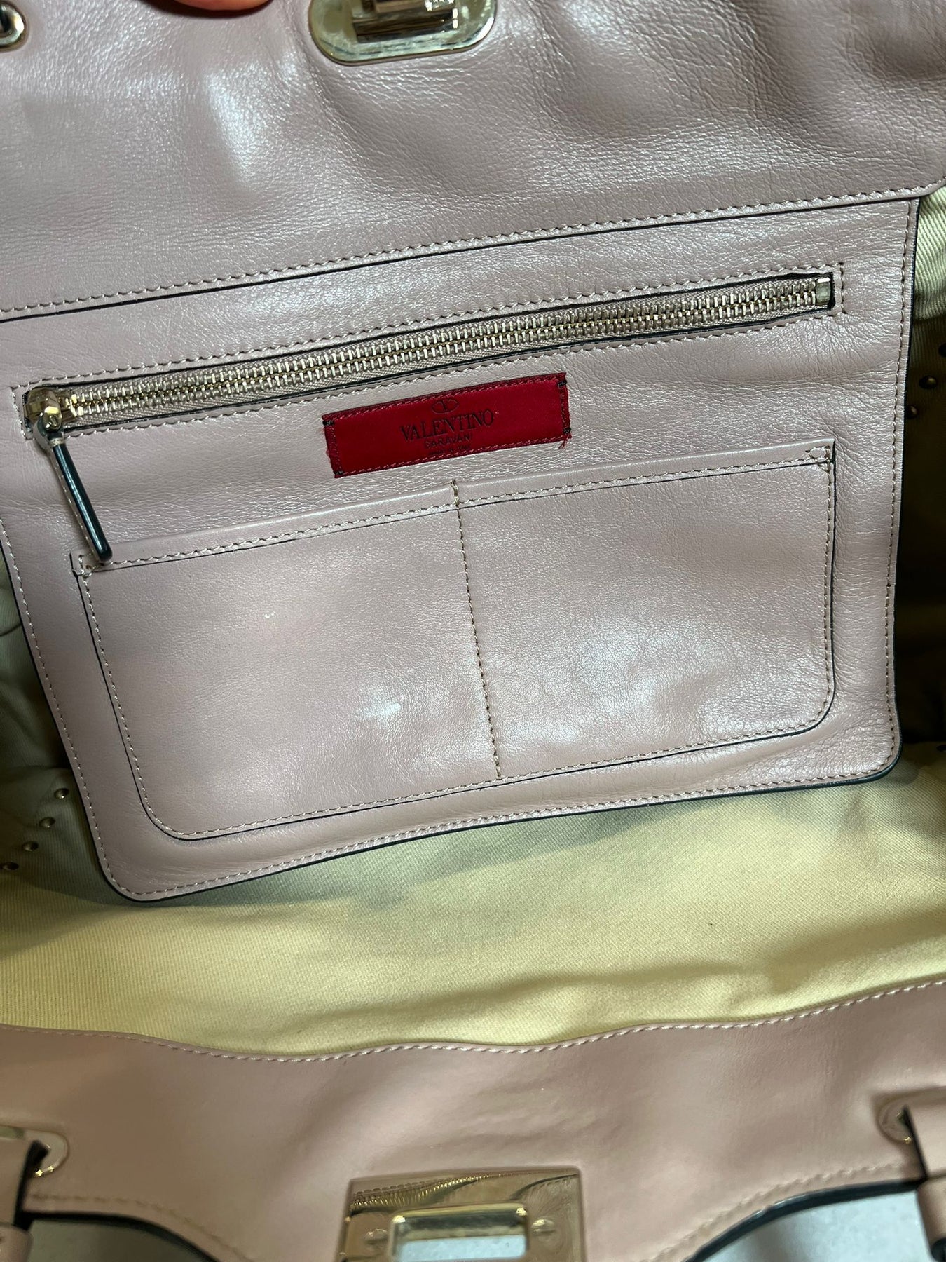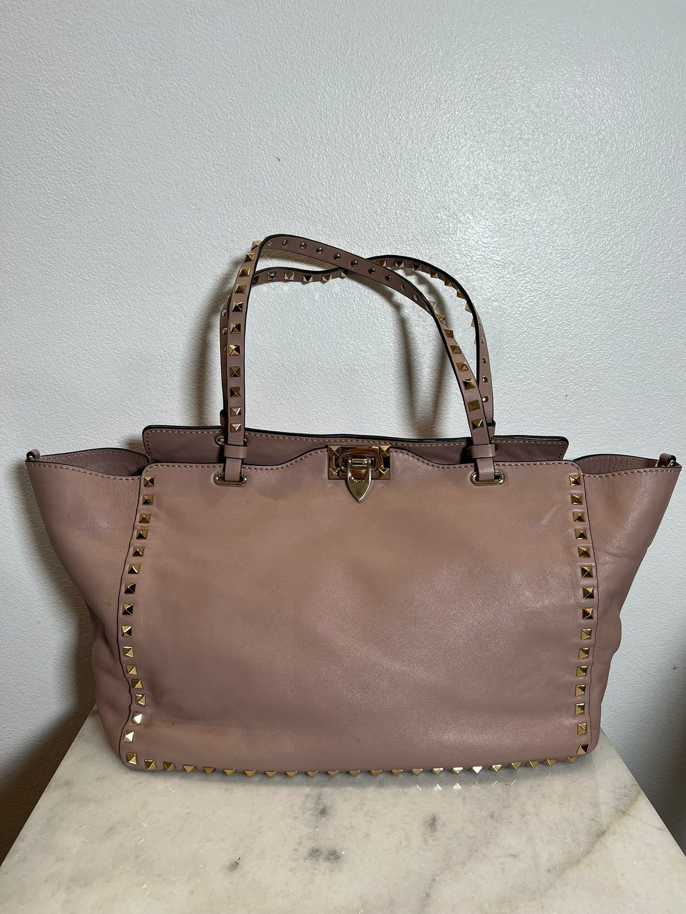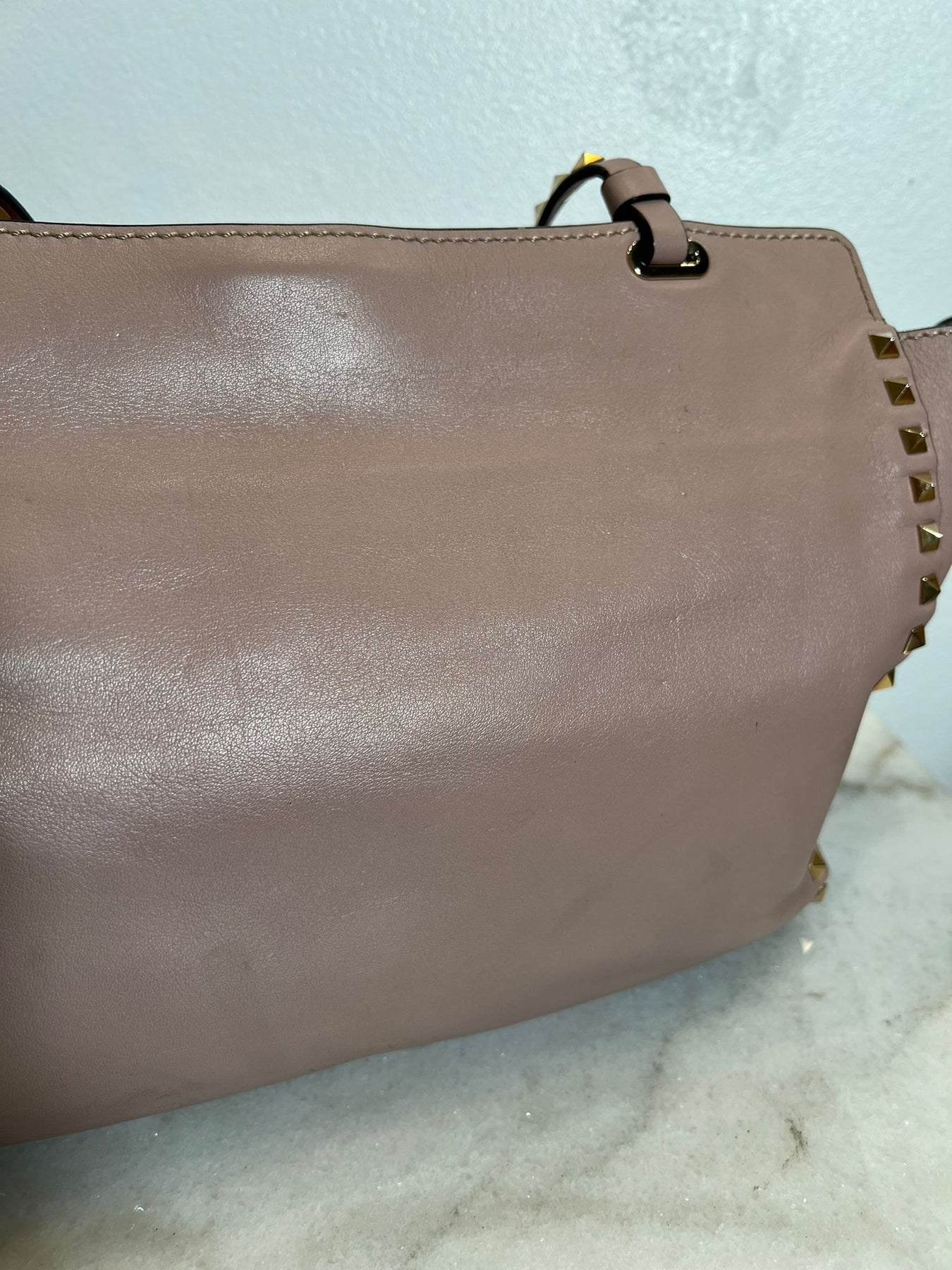 Description : Blush pink, condition 7/10, few marks on front and back and base, moderate wear, gold rockstud, 32x26x13cm, handle drop 20cm, no dust bag or box, comes with Entrupy certificate